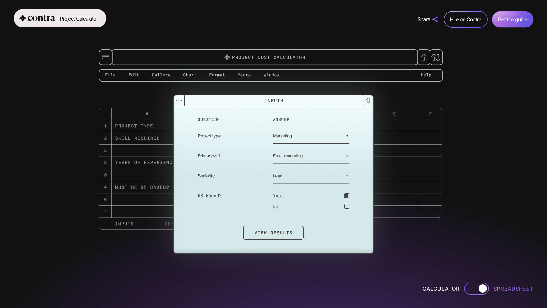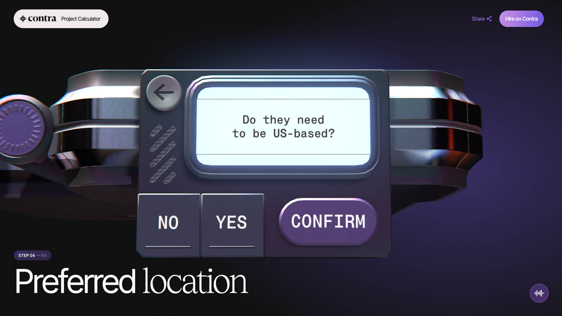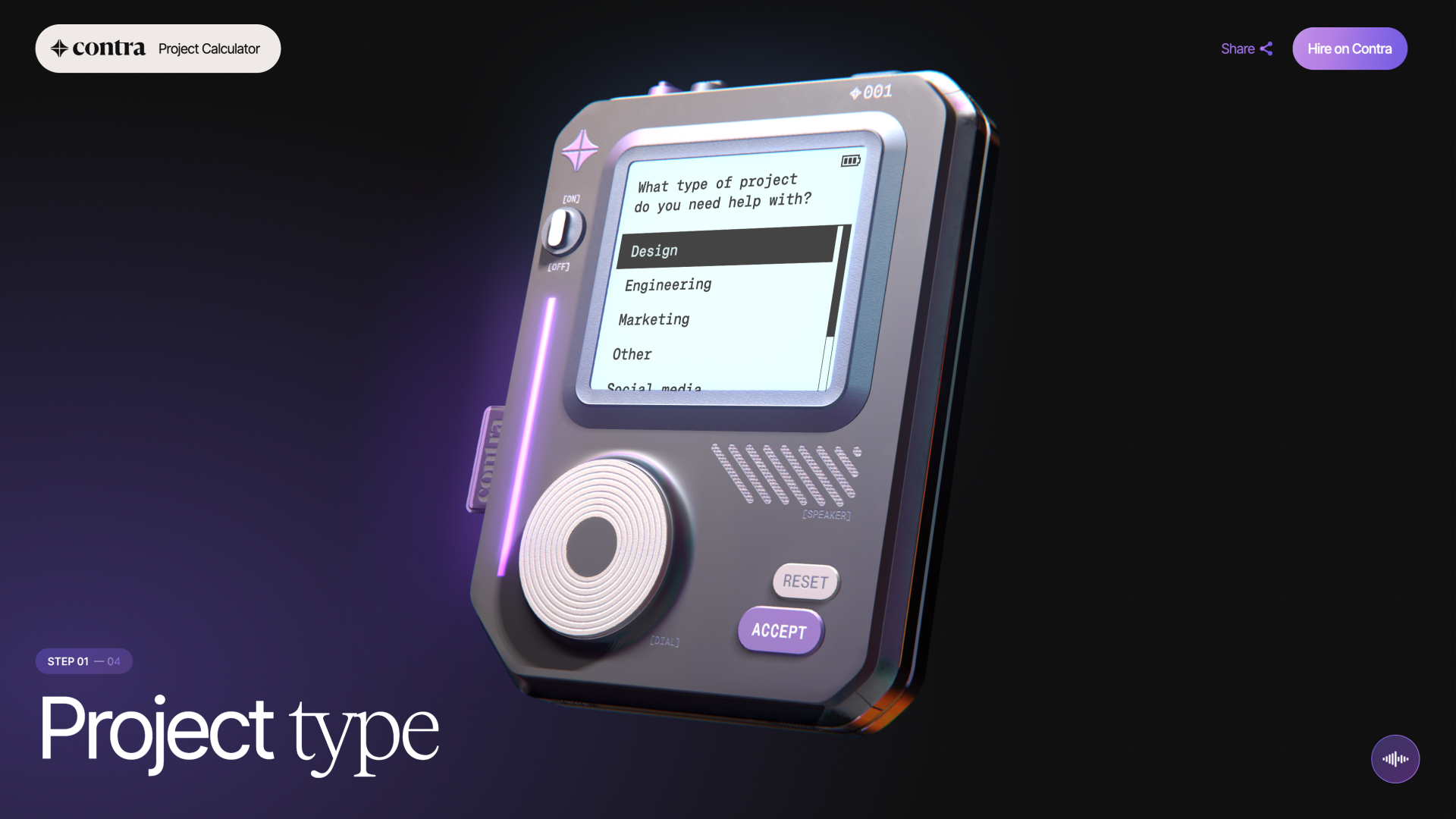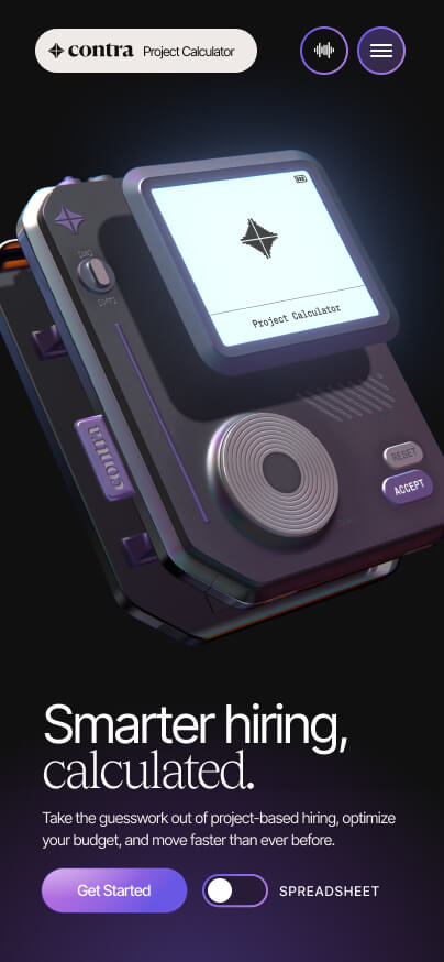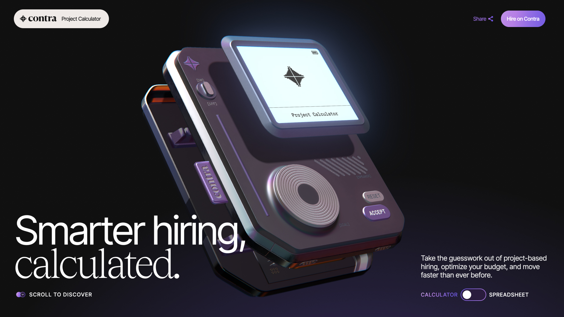 Contra’s project calculator is a gamified experience that helps users determine whether hiring a freelancer or full time roles is appropriate for their needs. The calculator analyses the requirements and benchmarks cost against time spent to compare total spend and time to impact for each option. The experience aims to create an engaging, memorable and shareable experience to promote Contra’s offering.